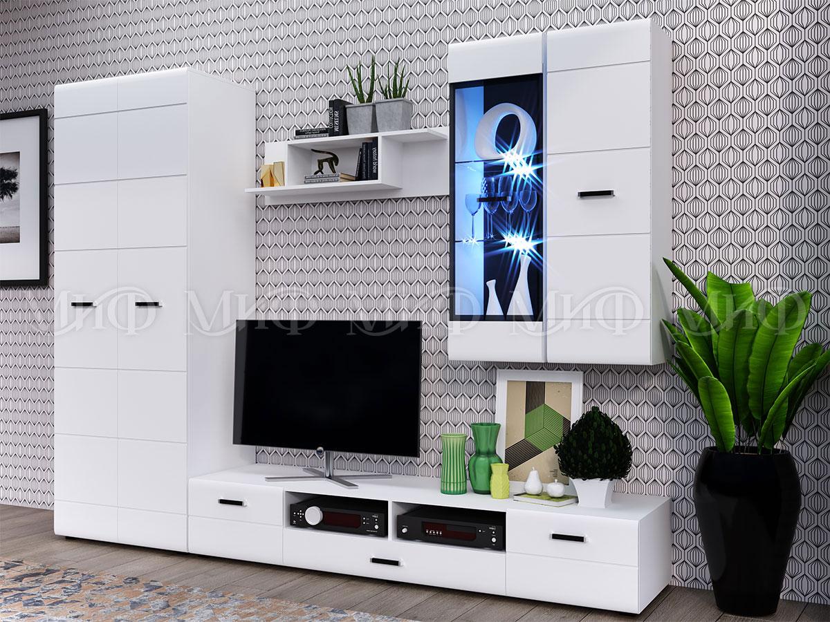 Гостиная Нэнси New 1 (МДФ): cтильная коллекция в цвете белый глянец, включает в себя различные витрины напольные и навесные, ТВ-тумбу, комоды и пеналы. Выдвижные ящики модулей оснащены шариковыми направляющими полного выдвижения. Подсветка в комплекте