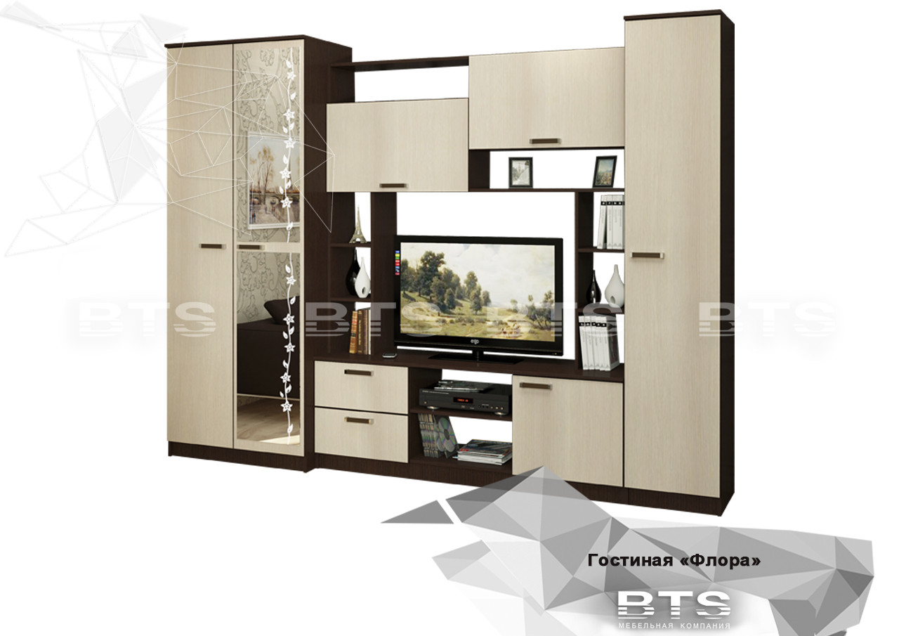 Гостиную «Флора» можно назвать настоящим символом утонченности и элегантности. Благодаря расцветки «венге» и «лоредо», - гостиная «Флора» сможет стать главным украшением любого современного интерьера, подчеркнув естественность и ненавязчивость оформления. Важнейшей особенностью гостиной «Флора» является высокая функциональность. Особый шик модели придают фурнитура цвета «металлик» и нанесённый на зеркало при помощи пескоструйной обработки цветочный орнамент и стразы Swarovski.