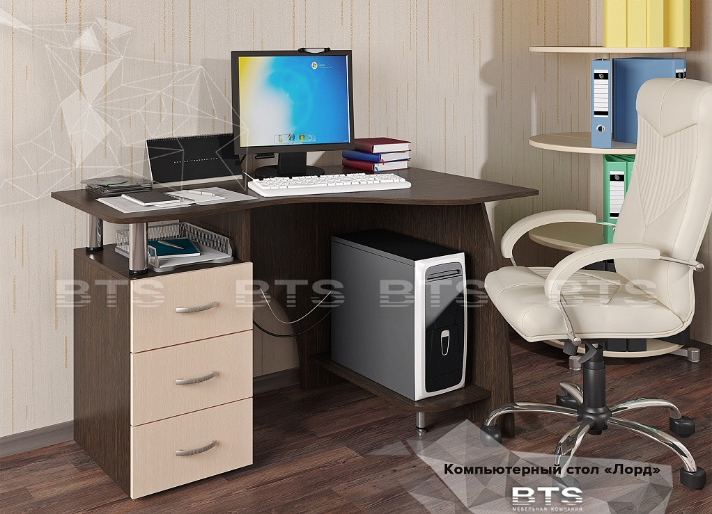 Стол компьютерный Лорд NEW компактный, но при этом весьма функциональный. Он станет основным элементом обустройства комфортного рабочего места. Компактное изделие с увеличенной столешницей анатомической формы понравится тем, кто ценит удобство.Тумба с дверцей и открытая ниша созданы для хранения канцелярских и прочих необходимых принадлежностей.