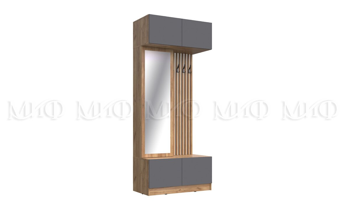 Шкаф с закрытыми полками и зеркалом предлагает место для хранения сезонных предметов одежды и аксессуаров, а также позволяет проверить свой облик перед выходом из дома.