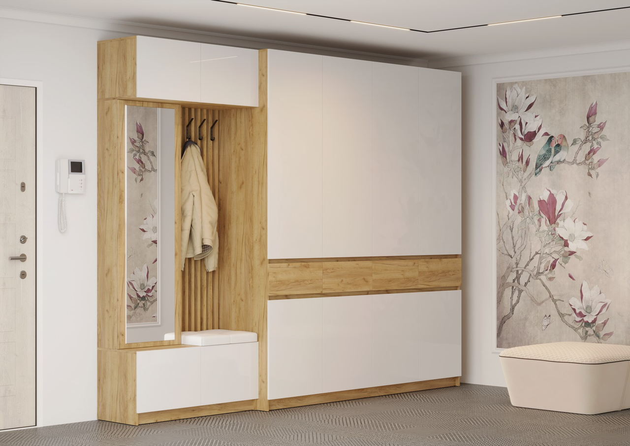 Вы можете создать прихожую, идеально подходящую под ваши требования. Четырехстворчатый шкаф с выдвижными ящиками можно расположить как с левой стороны, так и с правой.