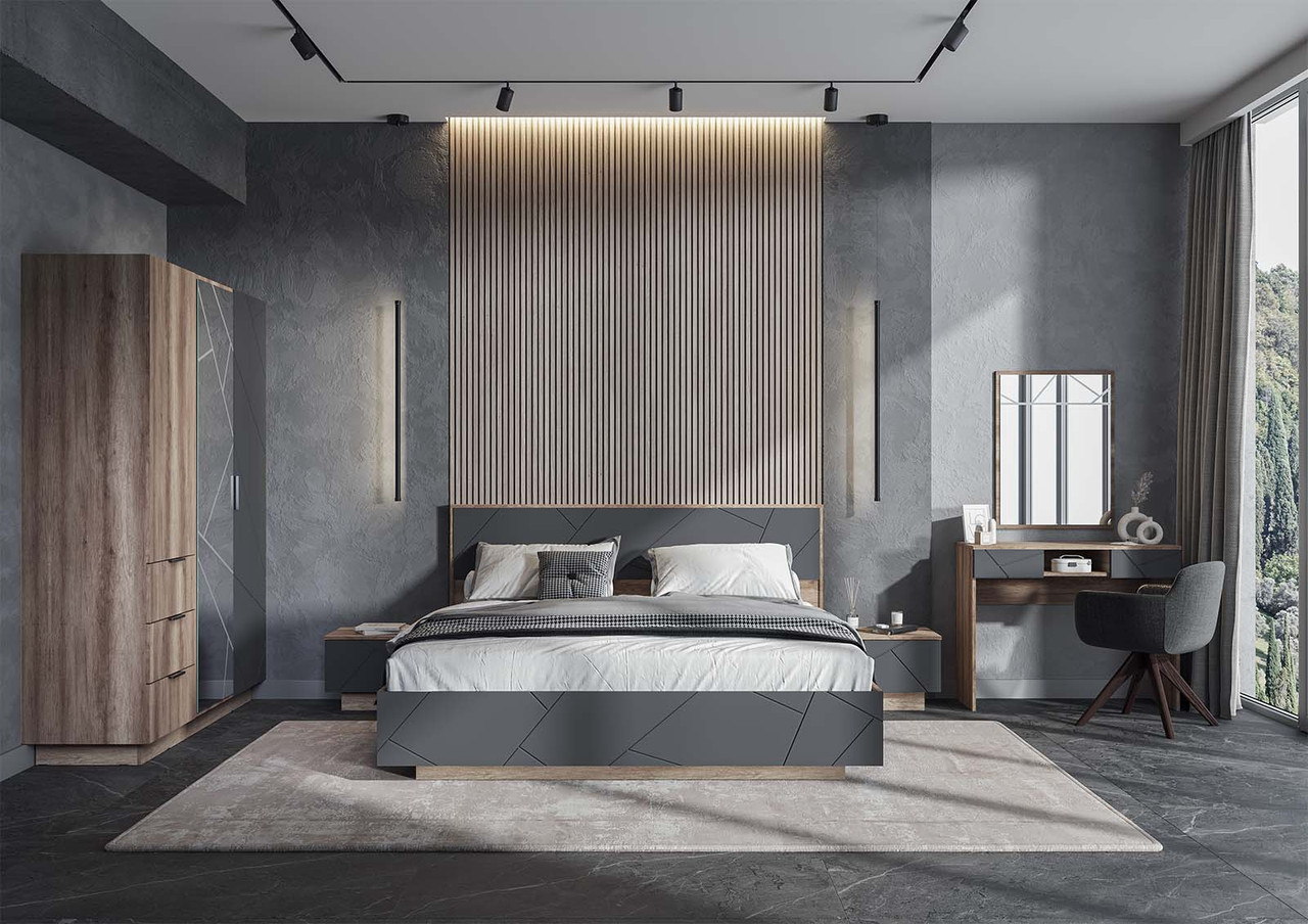 Дополнительный уют придаст наличие просторной кровати с двумя прикроватными тумбами по бокам. Несмотря на то, что модули темных оттенков дуба и графит, но наличие большого зеркала на фасаде шкафа и настенного, несомненно, расширит пространство вашей спальню.