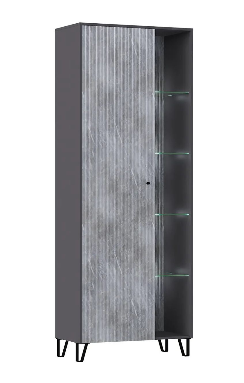 Шкаф "Оливия" с открытыми стеклянными полками, штангой за створкой, светодиодной подсветкой предоставит различные возможности использования в гостиной. Штанга за створкой предназначена для хранения платьев и курток, в то время как стеклянные полки с другой стороны могут размещать аксессуары или декоративные элементы.